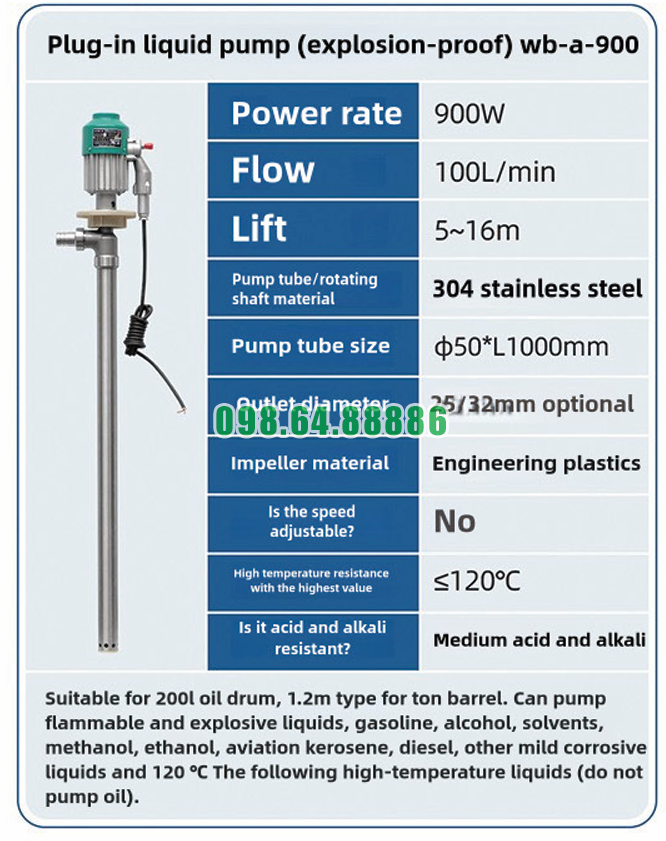 Máy có thể dùng để bơm xăng, cồn, methanol, ethanol, diesel, dầu hỏa hàng không và các chất lỏng ăn mòn nhẹ khác. Đây là yếu tố quan trọng làm nên tính linh hoạt khi sử dụng Máy bơm chất lỏng inox 304 chống cháy nổ WB-A-900 cho thùng phuy.