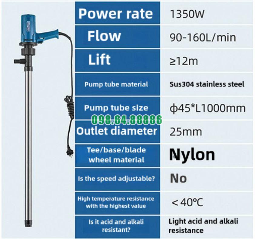 Ứng dụng bơm hóa chất nhẹ bằng Bơm điện hút thùng phuy JDT-1350W-SUS304N