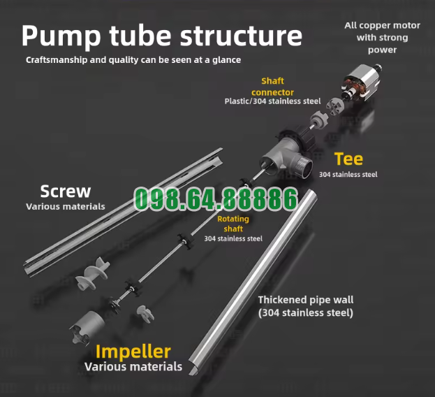 Hiệu quả của động cơ không tách rời khỏi cấu tạo tổng thể của máy. Model này sử dụng ống bơm và trục quay inox 304, cùng với cánh bơm inox SUS304 nguyên khối, giúp lực từ động cơ được truyền ổn định xuống cụm bơm. Sự đồng bộ này góp phần làm tăng độ bền và khả năng vận hành lâu dài của thiết bị.