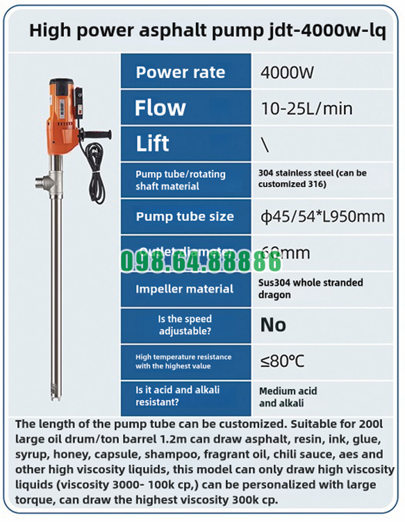 Thông số Bơm nhựa đường cầm tay hút từ thùng phuy JDT-4000W-LQ