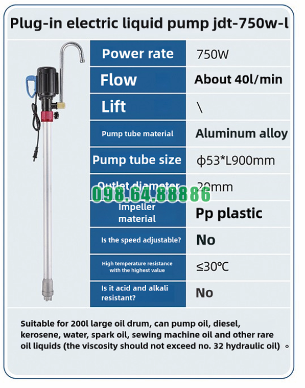 Máy bơm điện chuyên dùng cho thùng phuy JDT-750W-L là một thiết bị rất đáng tin cậy khi cần duy trì áp suất ổn định trong quá trình bơm chất lỏng. Với công suất ổn định 750W, khả năng bơm nhanh chóng và hiệu quả, máy bơm này giúp duy trì áp suất đều đặn khi bơm các loại dầu, nước và các chất lỏng khác, đặc biệt trong các ứng dụng công nghiệp. Máy không chỉ giúp tăng hiệu suất công việc, mà còn giảm thiểu rủi ro và bảo vệ thiết bị trong suốt quá trình bơm, mang lại sự an toàn và hiệu quả tối ưu cho người sử dụng.