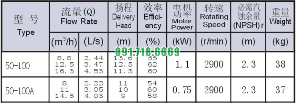 Bảng thông số kỹ thuật bơm nước li tâm trục ngang SLW-ISW50-100