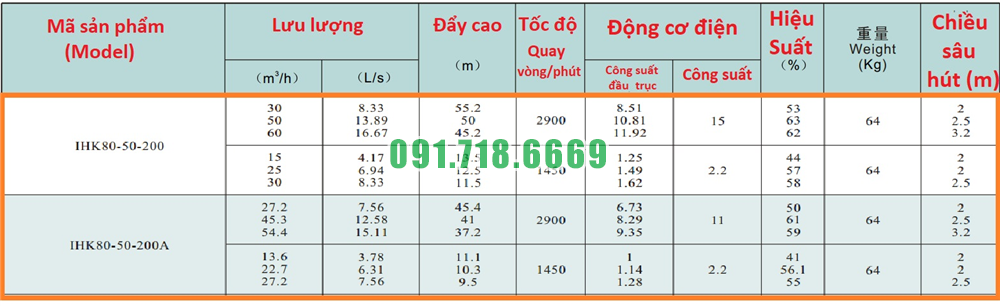 Bảng lưu lượng của máy bơm nước cánh hở IHK80-50-200 động cơ điện 15 kw