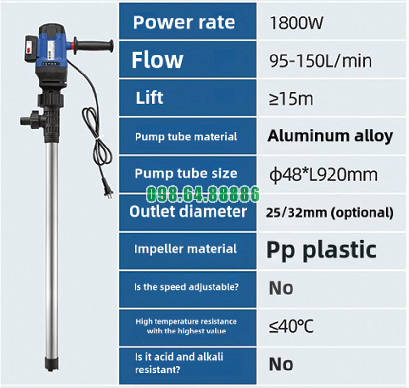 Môi trường hóa chất luôn đặt ra yêu cầu khắt khe đối với thiết bị chiết rót: phải chịu ăn mòn, vận hành ổn định và duy trì tuổi thọ lâu dài. Bơm điện thùng phuy cao cấp JDT-1800W-L92 được đánh giá cao về độ bền khi làm việc trong môi trường hóa chất nhờ cấu tạo và thiết kế được tối ưu chuyên biệt cho điều kiện khắc nghiệt này.