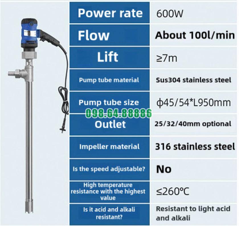 Bơm chìm hút thùng phuy nhiệt độ cao JDT-600W-G260 được thiết kế theo hướng tối giản trọng lượng nhằm tăng sự tiện dụng và đáp ứng nhu cầu thao tác nhanh trong môi trường công nghiệp. Dù nhẹ và gọn, thiết bị vẫn giữ được độ bền cao và khả năng chịu nhiệt tốt, phù hợp với các ứng dụng đòi hỏi tính linh hoạt.