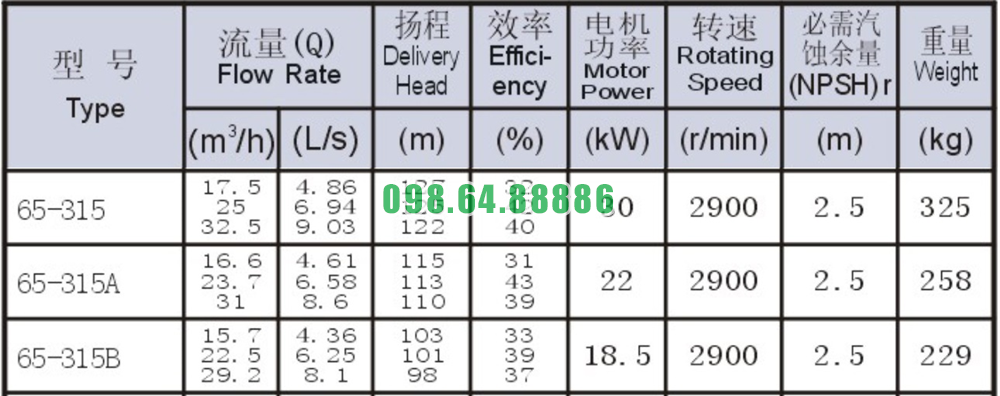 Bảng thông số kỹ thuật bơm nước li tâm trục ngang mode SLW65-ISW65-315 động cơ 30 kw công suất 9.03 L/s