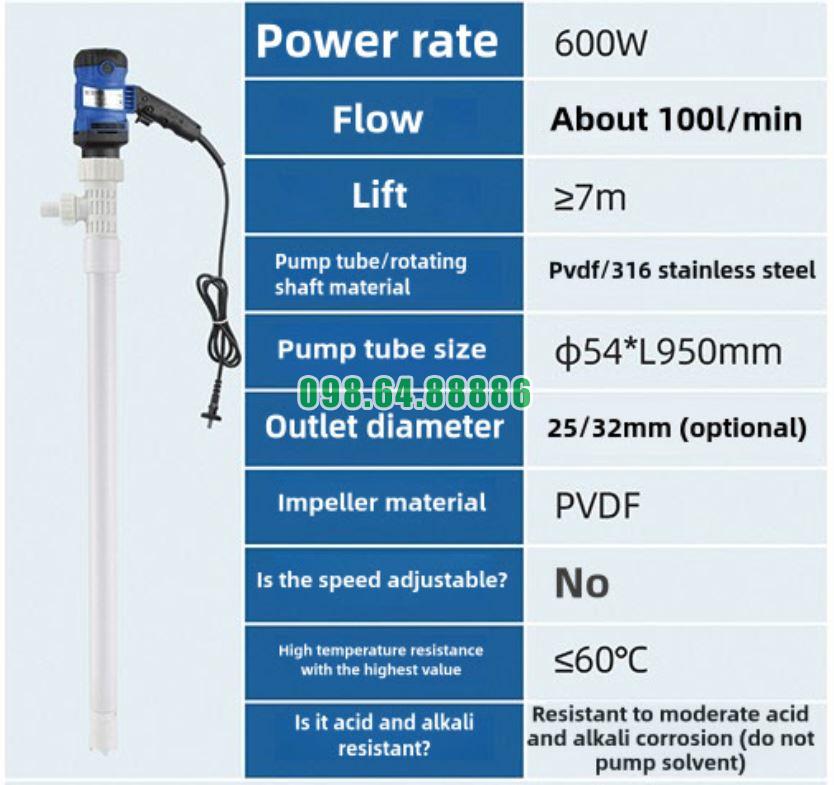 Máy bơm thùng phuy cắm điện JDT-600W-PVDF – Giải pháp tăng cường an toàn lao động trong công nghiệp