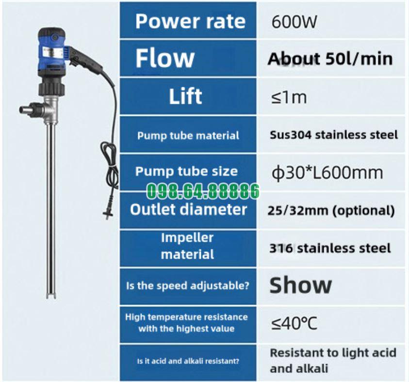 Bơm hút xả phuy bằng điện model JDT-600W-30SUS304 là thiết bị quan trọng trong ngành hóa chất, hỗ trợ hiệu quả cho các công đoạn chiết rót, pha chế, vận chuyển và xử lý hóa chất. Với vật liệu inox SUS304 chống ăn mòn, thiết kế chắc chắn và lưu lượng ổn định, model này giúp đảm bảo an toàn, tăng năng suất và duy trì độ bền lâu dài trong môi trường hóa chất khắc nghiệt.