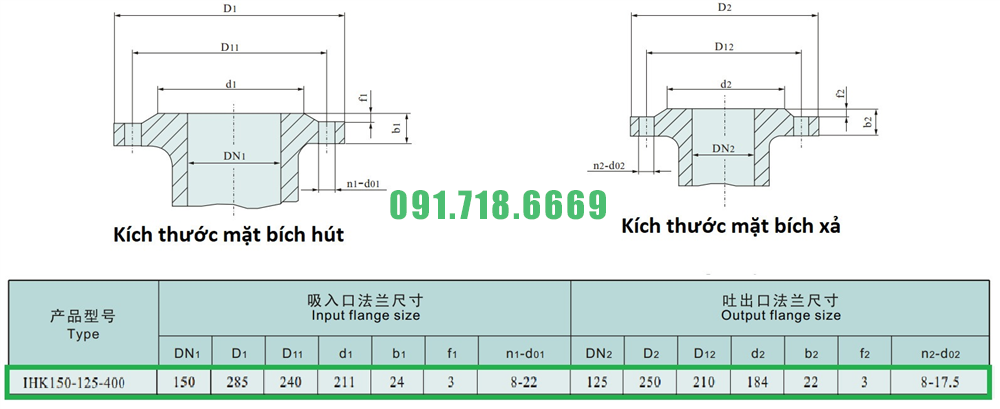 Kích thước mặt bích của bơm li tâm cánh hở model IHK150-125-400