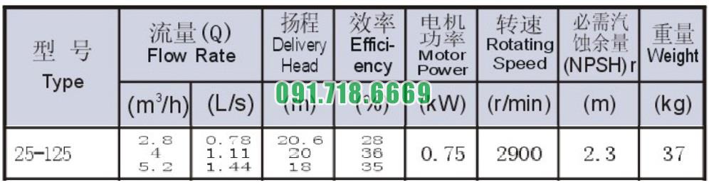 Bảng thông số kỹ thuật bơm nước trục ngang ISW25-125 lưu lượng 1.44 L/s