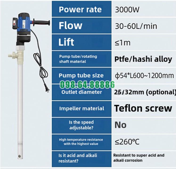 Một yếu tố khác giúp Bơm trục vít cầm tay hút thùng phuy JDT-3000W-PTFELG xử lý tốt chất lỏng siêu nhớt là động cơ công suất 3000W. Công suất mạnh giúp trục vít tạo lực quay lớn để vận chuyển các chất lỏng có độ nhớt cao.