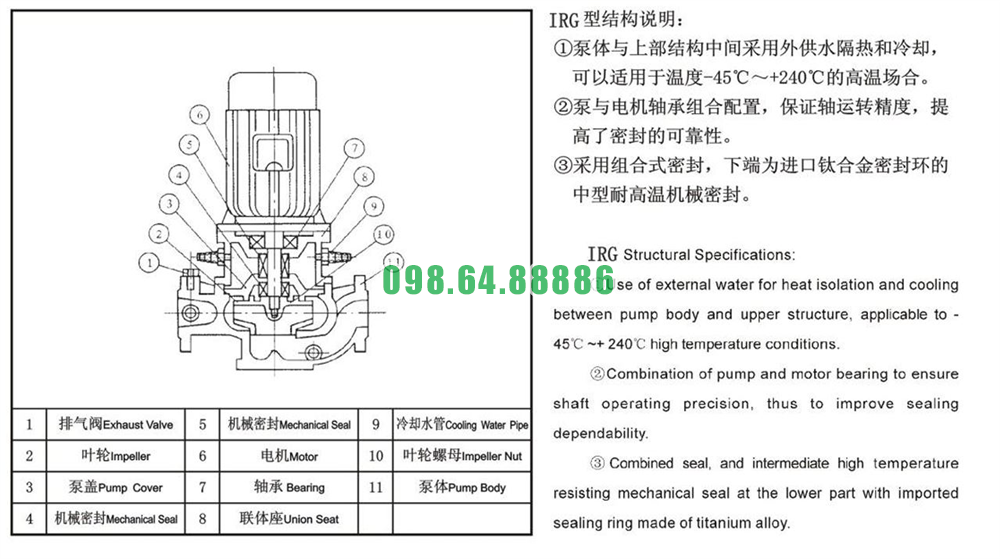 IRG80-350 dùng inox 316 hoặc thép hợp kim chịu nhiệt, phớt SiC và gioăng Viton/PTFE, bảo đảm không biến dạng khi làm việc với nước nóng đến 120–140°C.