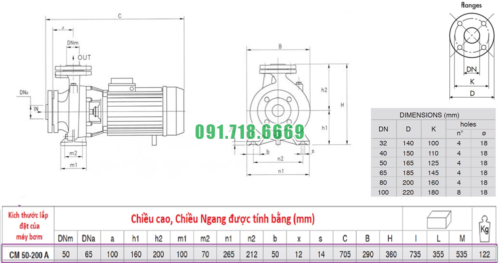 Kích thước máy bơm nước li tâm trục ngang CM50-250C có điện áp 380v